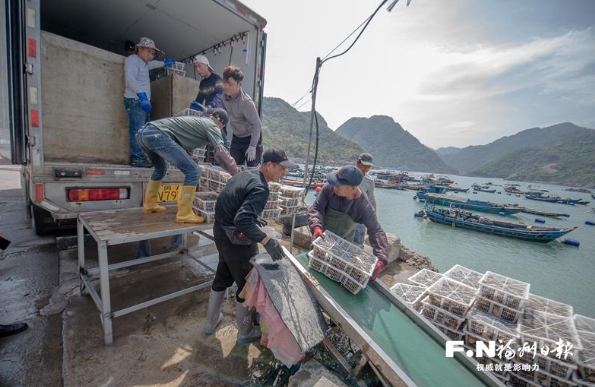 早年渔民需在渔排上手艺称重,鲍鱼简单脱水。直到3年前,村里自筹资金建成全省首条渔排传送带,“海上电梯”改变了传统作业形式。“现在在采收旺季,高峰期每天过秤2万筐,总重超百吨。”码头担任人陈义忠说。
