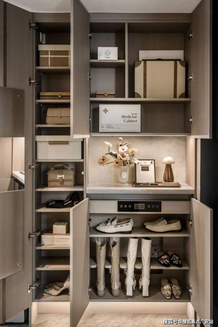 玄关柜设置消毒精灵,在保持健康居家环境的同时,也让生活的情绪感满满。长靴隔板方便长靴的护理与收纳。换季鞋盒收纳区,逐步提升收纳空间。